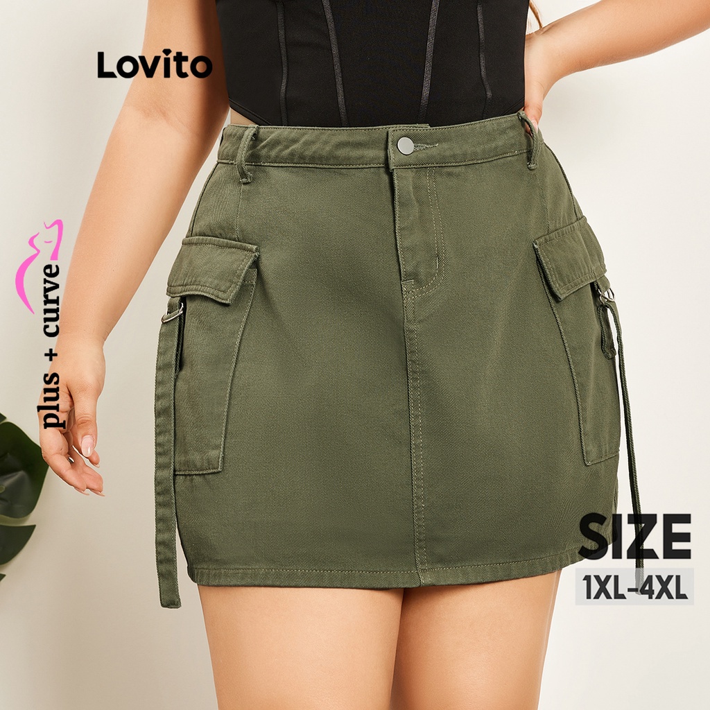 Lovito Plus Size Saia Feminina Curvas Casual Lisa Com Bolso E Zíper LPS07028 (Verde)