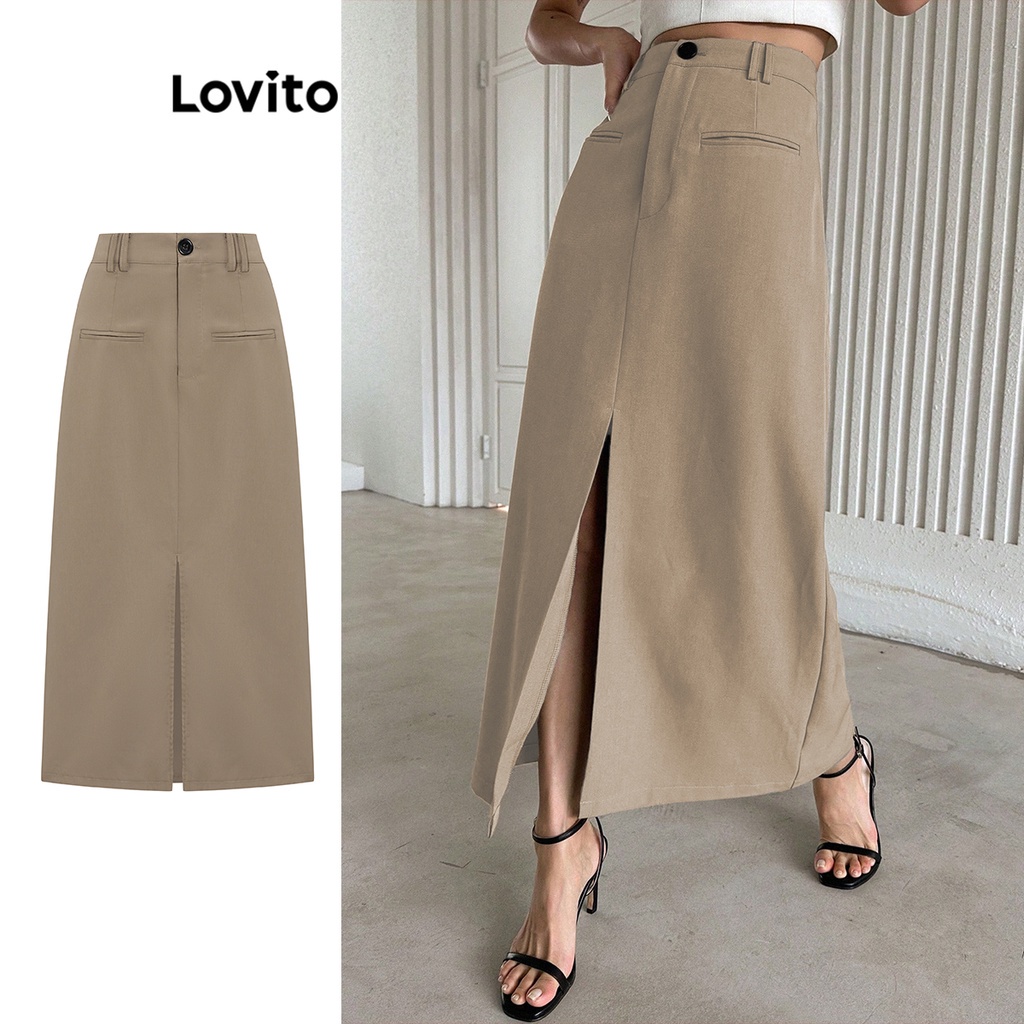 Lovito Casual Saia Feminina Lisa com Fenda Traseira e Bolso L70AD066 (Cinza)