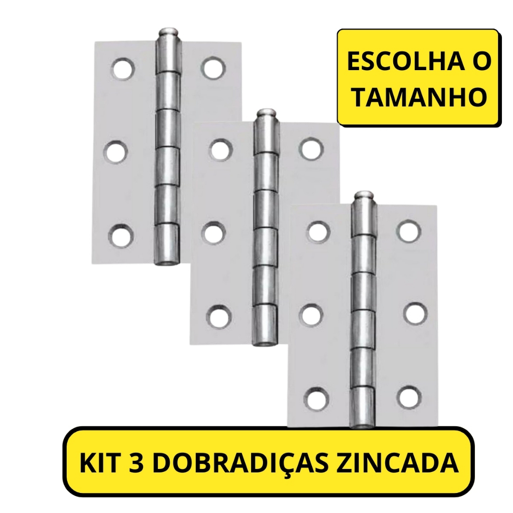 Kit 3 Dobradiça Zincada Para Porta De Madeira - 1.1/2" - 2" - 2.1/2" - 3" - 3.1/2" - 4"