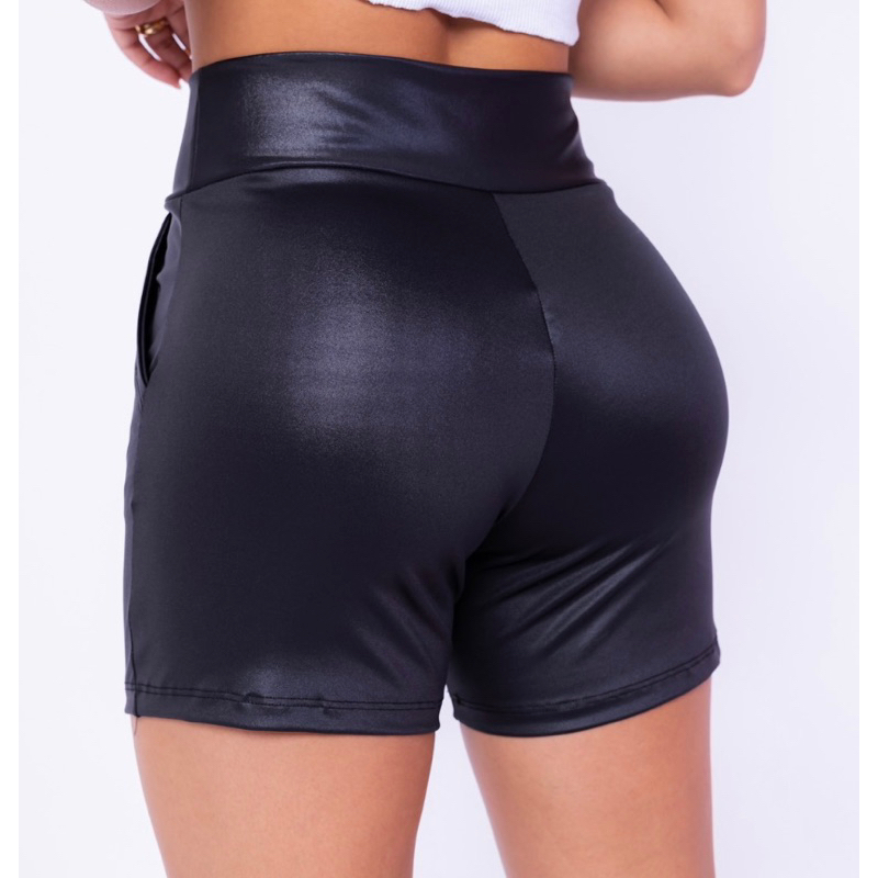 Short Cirre Couro Fake Feminino Cintura Alta Com Cinto Bolso Shorts Preto