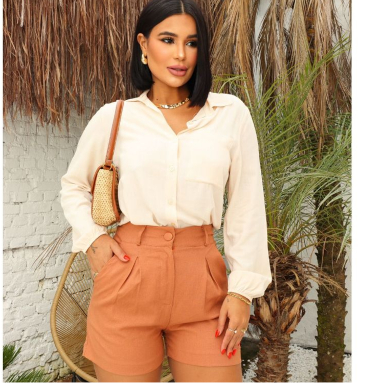 Shorts Feminino Cintura Alta com Cinto Linho Bolso e zíper Lateral Novo Short Meia Coxa