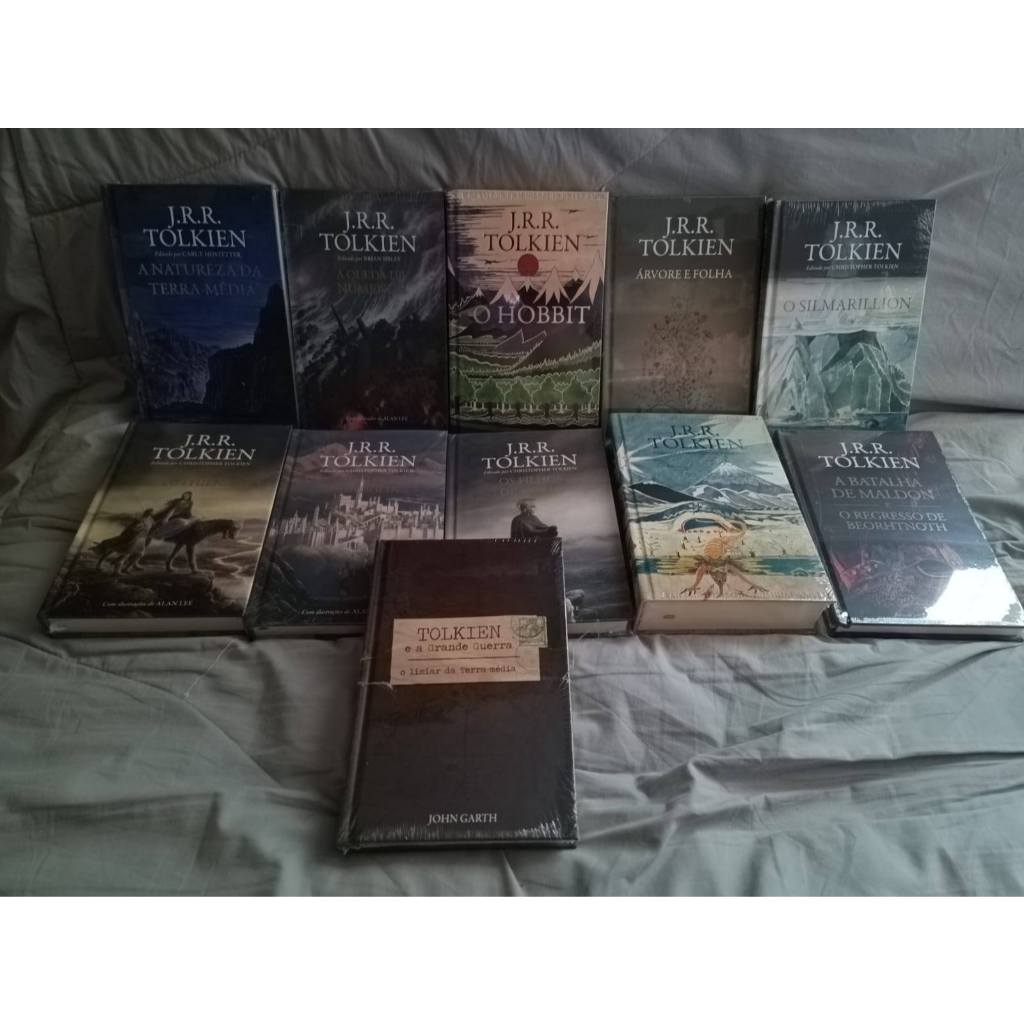 kit Tolkien com 11 livros capa dura, o hobbit, o silmarillion, contos inacabados, a natureza da terra media, tolkien a grande guerra, arvore e folha, a queda de numenor, beren e luthien, os filhos de hurin, a queda de gondolin, a batalha de maldon e o reg