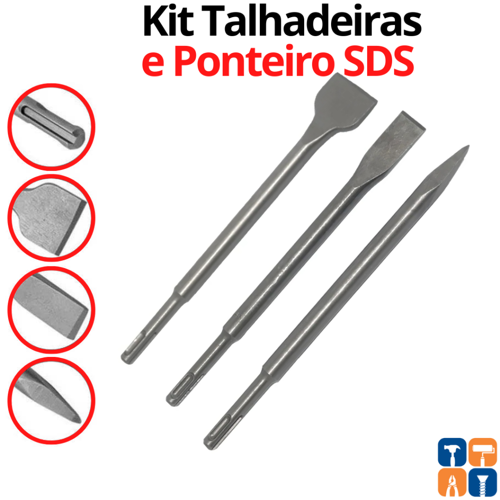 Kit Talhadeiras SDS e Ponteiro SDS Plus para Martelete Kit com 3