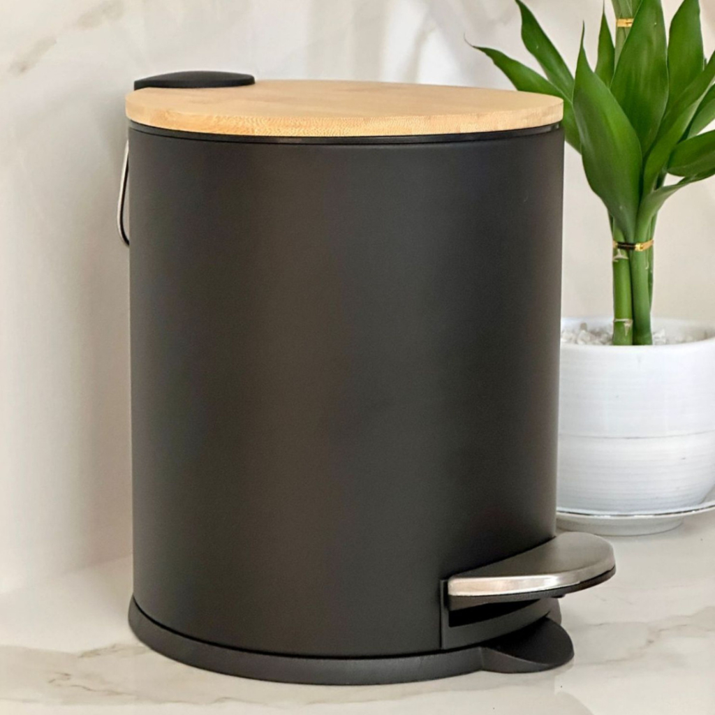 Lixeira Banheiro Cozinha Inox c/ Pedal Tampa de Bambu Cesto Lixo 5L e 3L