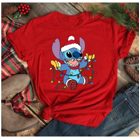 Camiseta Básica de Algodão Moda Verão Natal Desenho animado Stitch
