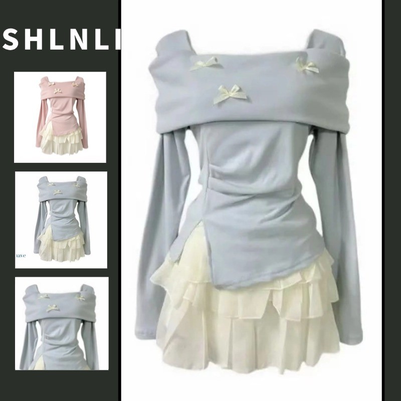 Conjunto Feminino De Verão Doce E Fofo , Ombro De Fora , Manga Comprida , Top + Saia De Cor Sólida , De Duas Peças