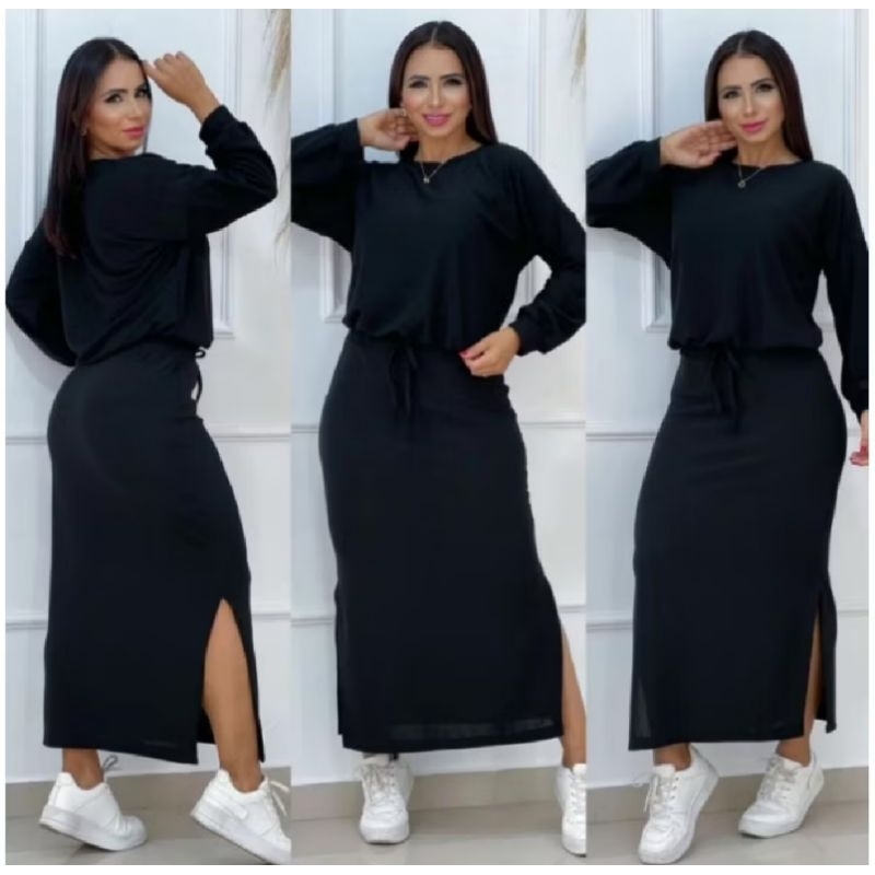 Conjunto Feminino Outono Inverno Blusa Cropped e Saia Midi Lanzinha