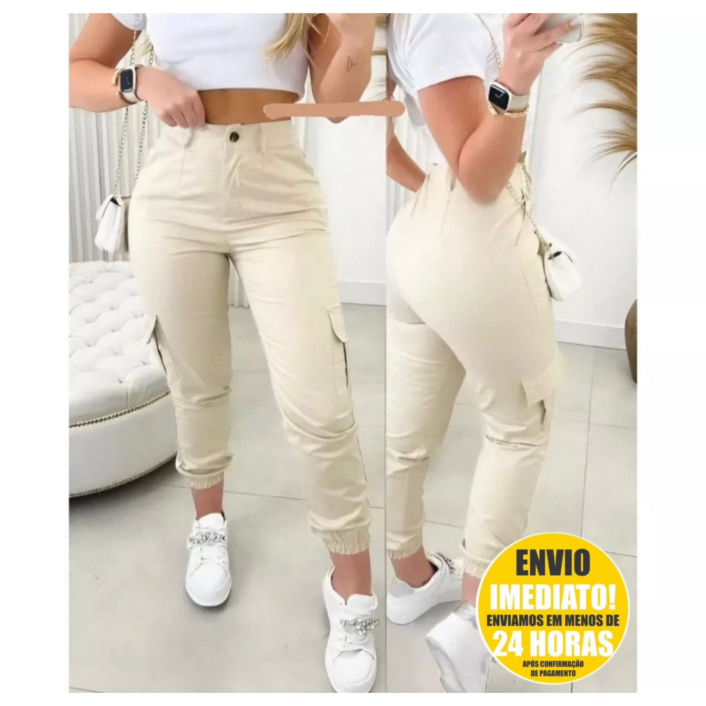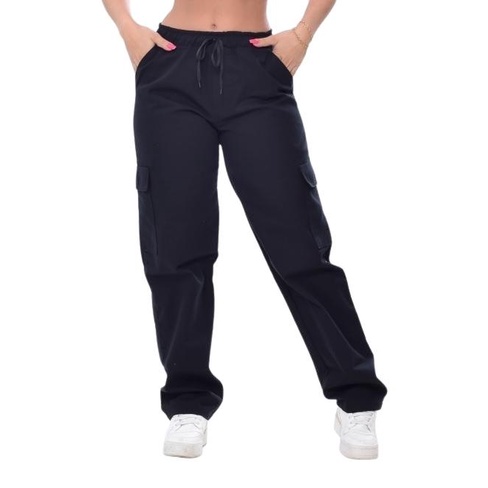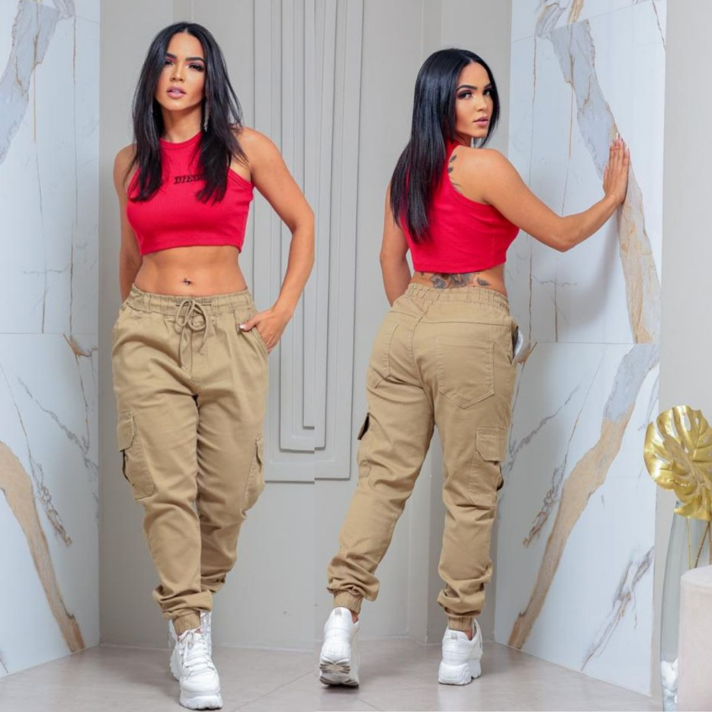 CALÇA CARGO JOGGER FEMININA SARJA COM BOLSOS LATERAIS DE BLOGUEIRA