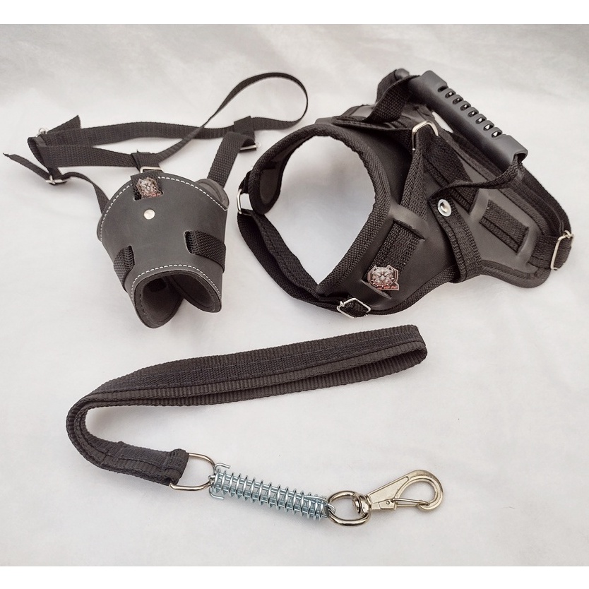 OFERTA ! Peitoral Coleira para Cachorro em couro sintético com alça + Guia com amortecedor Pet Pitbull Pastor Rottweiler e focinheira ajustável