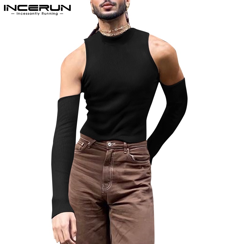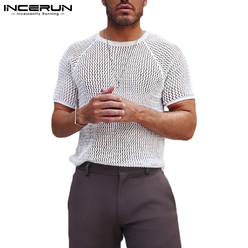 INCERUN Camiseta Masculina De Malha Manga Longa Vazada Slim Fit