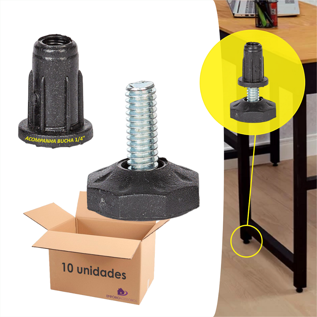 Kit 10 Pé Sapata Nivelador Regulável 1/4 24mm Com Bucha