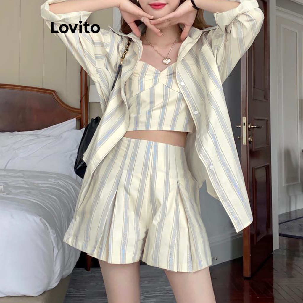 Lovito Boho Conjunto Feminino Listrado Alinhado de Shorts Plissado L71ED128 (Colete/Shorts/Camisa)