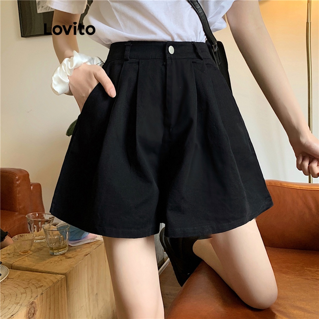 Lovito Casual Shorts Feminino Liso de Cintura Média LNA11031 (Preto)