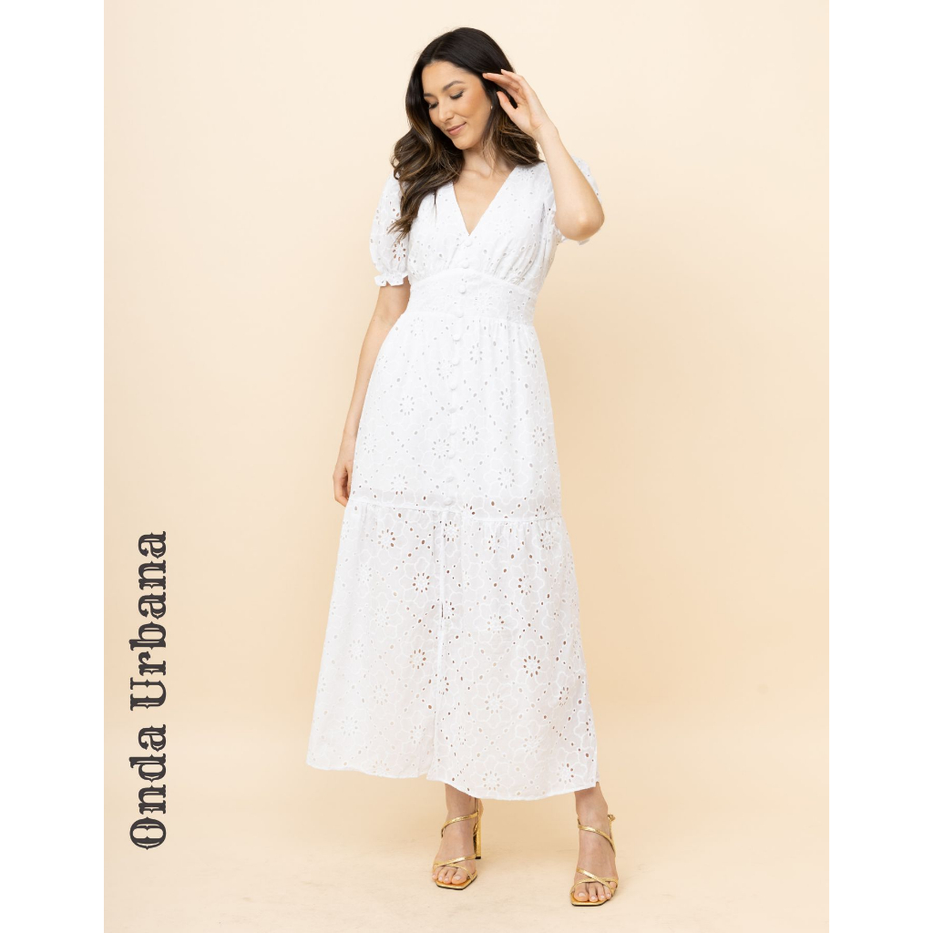 VESTIDO LONGO ALGODÃO LAISE BORDADOS PERFURADOS MANGA CURTA BUFANTE EVANGÉLICA DETALHE DE BOTÕES COM ABERTURA NA FRENTE - BRANCO