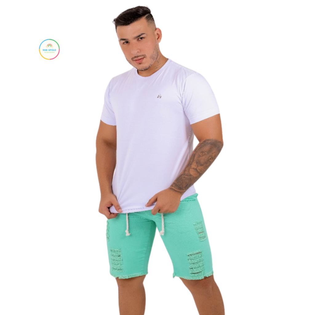 Bermuda Jeans Masculino Casual Verde Água Com Cordão Modelo Detonado Moda Masculina Short Tendência