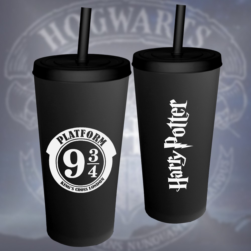 Copo Harry Potter Com Tampa e Canudo Personalizado Preto Branco Plataforma 934 600 ml