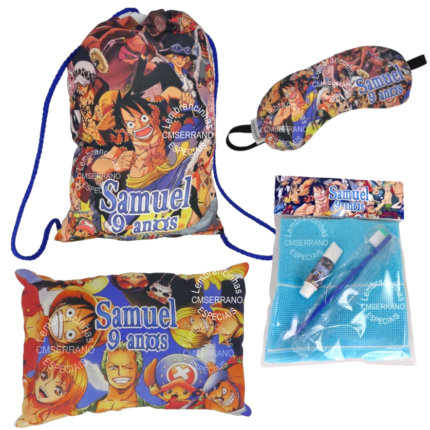7 Kit Festa Pijama Almofada 30 x 20 cm + Mascara para Dormir Tapa Olho + Kit Higiene + Mochila Tecido
