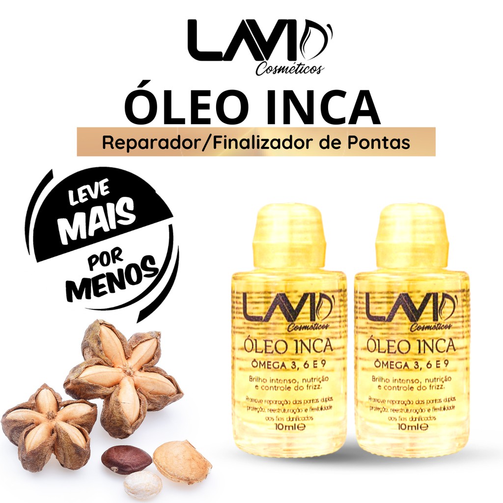 Reparador e Finalizador de Pontas KIT 3 Unidades óleo Inca Lavid. Sua combinação única de Ômega 3, 6 e 9, penetra profundamente na fibra capilar garantindo cabelos nutridos, sem frizz, brilhantes e saudáveis.