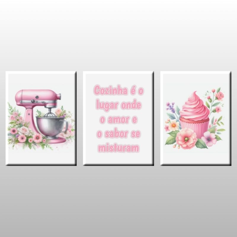 Kit 3 quadros decorativos para cozinha rosa - modelo 2
