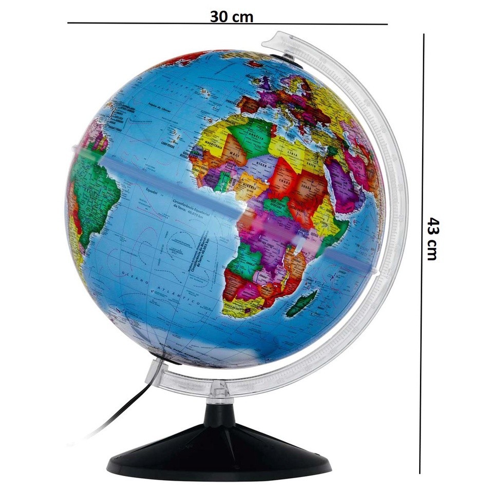 Globo Terrestre Histórico Fisico Político c/ Luz Led - 30cm Diâmetro e 43cm Altura