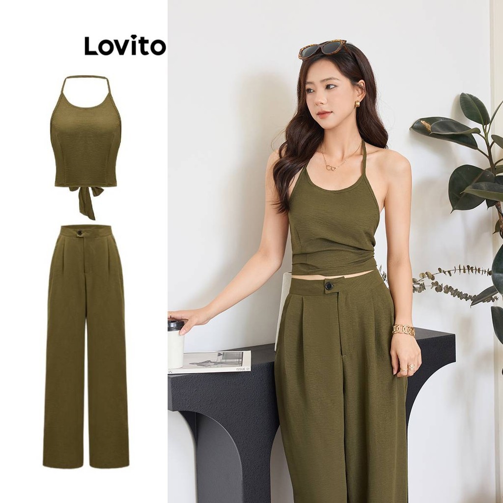Lovito Conjuntos de calças plissadas Boho Plain Bow Back para mulheres L91AD052