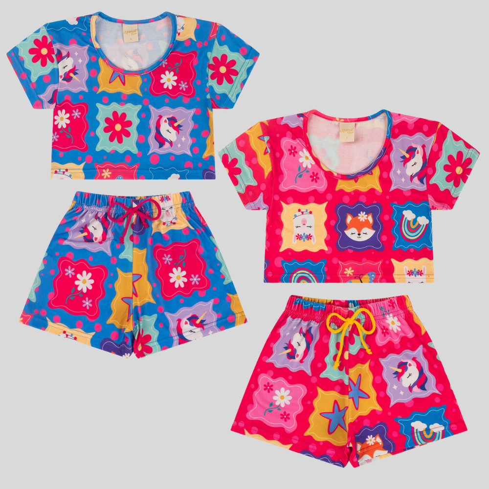 Conjunto Verão Menina Infantil Cropped e Shorts Unicórnio