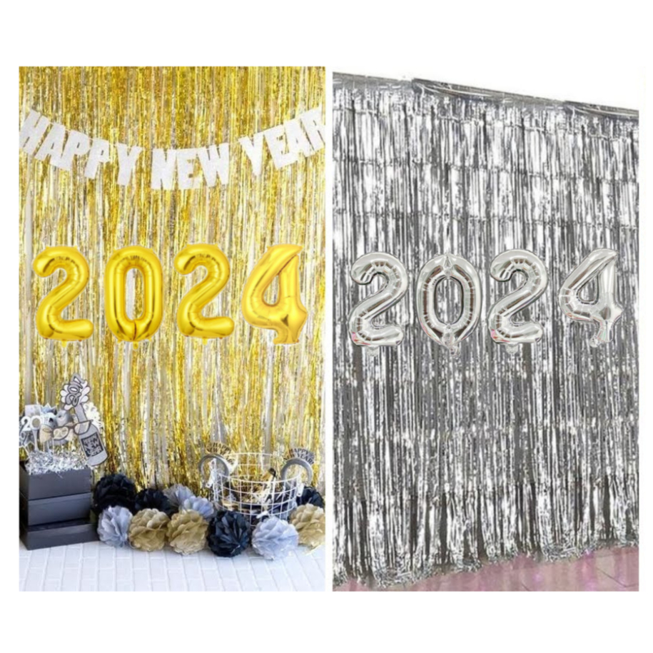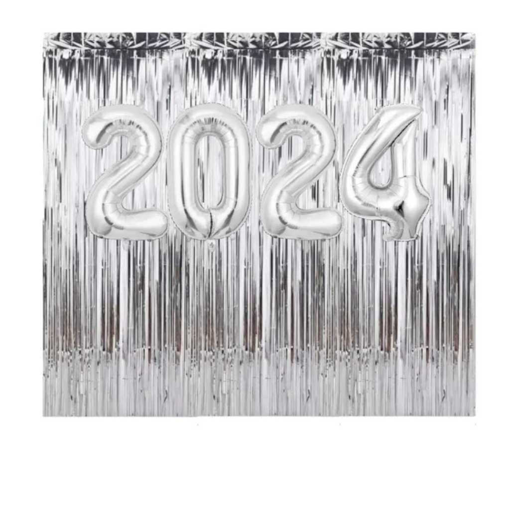 Kit Balões Metalizados 2024 / Feliz Ano Novo + 2 Cortinas Metalizadas