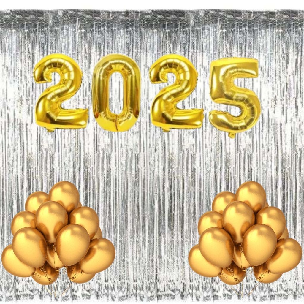 Kit Balão 2025 + 25 Bexigas + 2 Cortinas Metalizadas Franja Ano Novo Decoração Reveillon