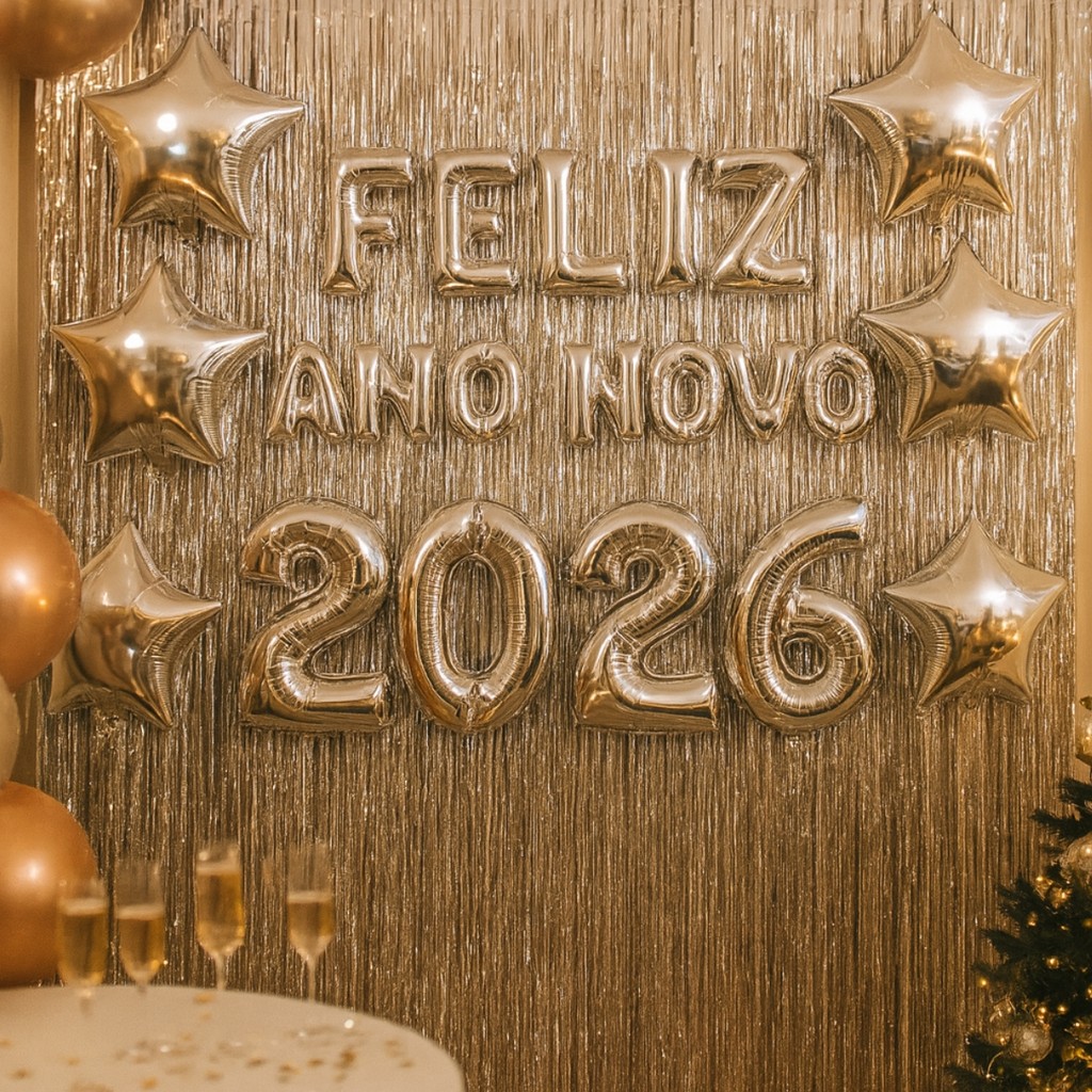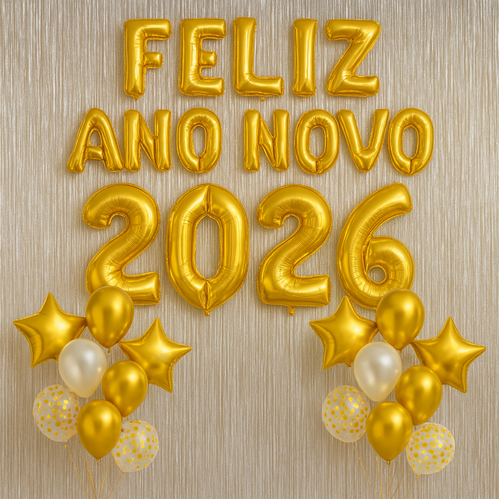 Kit Balão Ano Novo 2026 80 cm + 10 Bexigas + 2 Cortinas Metalizadas Reveillon