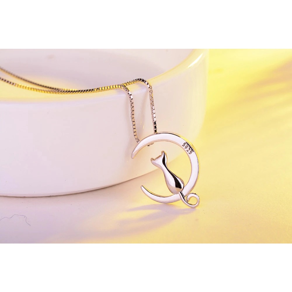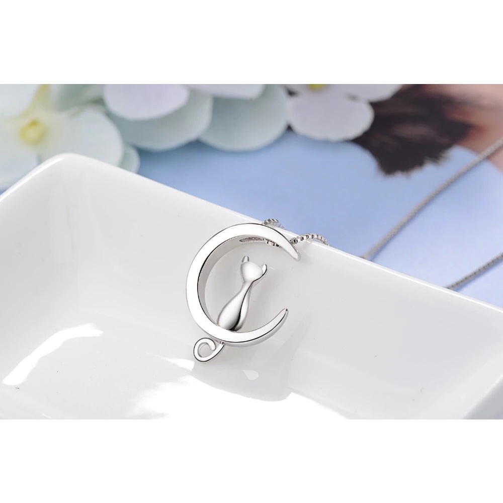 Choker Colar Feminino Corrente em Prata Esterlina 925 & Pingente Gato e Lua 45cm