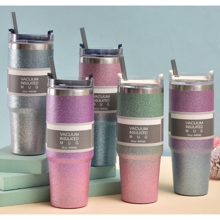 Copo térmico em inox com tampa cor degrade glitter LUXO com canudo 890 ml