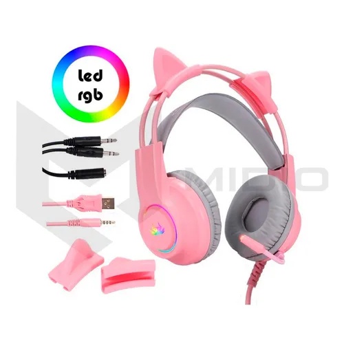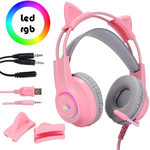 Fone Headset Gamer Gatinho com Fio e LED RGB Fone de ouvido- Orelhas Removíveis, Microfone e Controle de Volume - Estilo, Conforto e Imersão Total nos Jogos