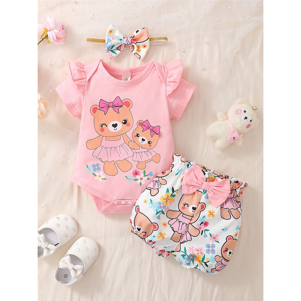 0-2 Anos Conjunto De Roupas Diárias Para Bebês Recém-Nascidos Cartton Bear Print Manga Curta Romper + Shorts Com Fita De Cabeça Roupa De Verão Lovely 3PCS