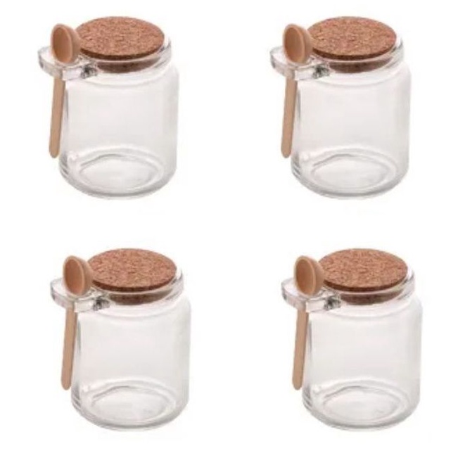 Kit 4 Potes de Vidro com Colher de Bambu e Tampa de Rolha 250ml Saleiro Açucareiro