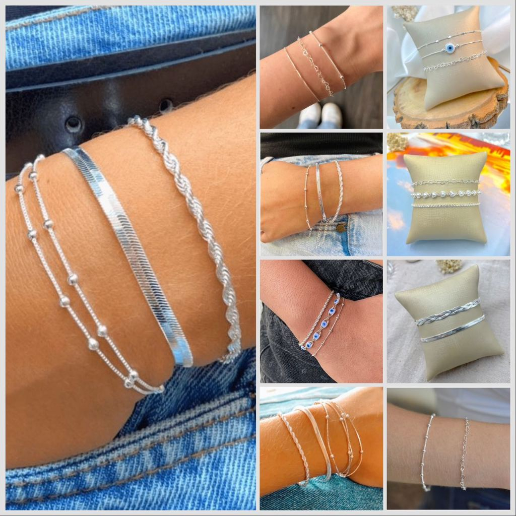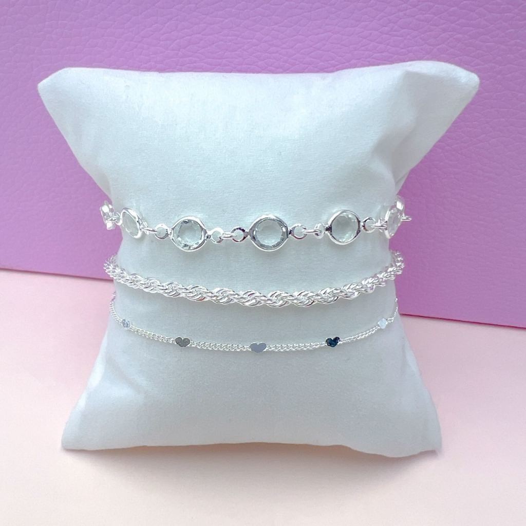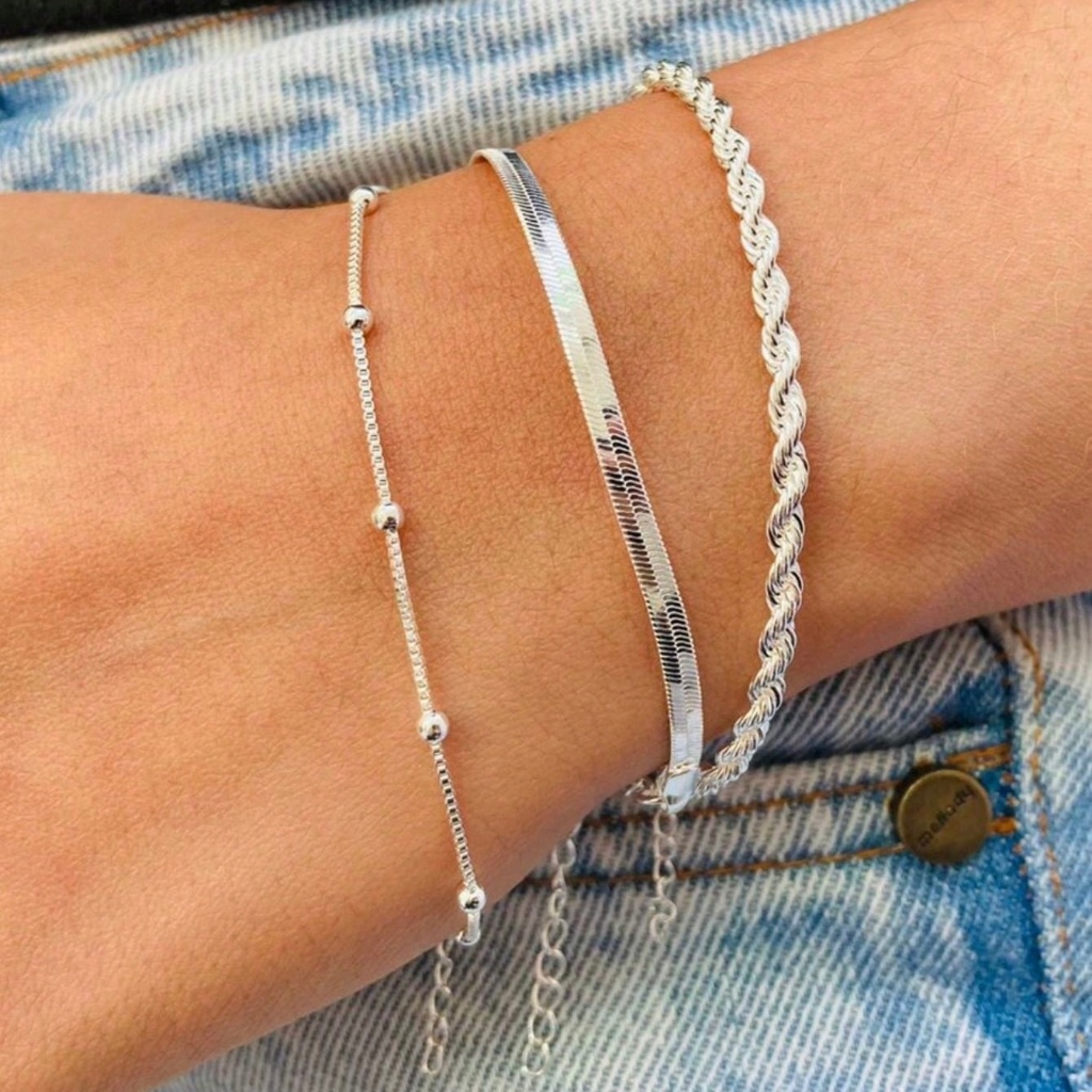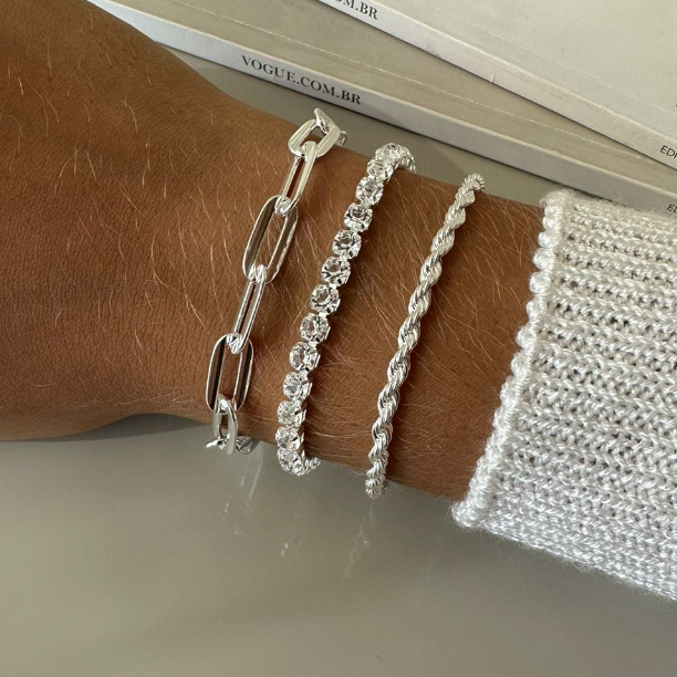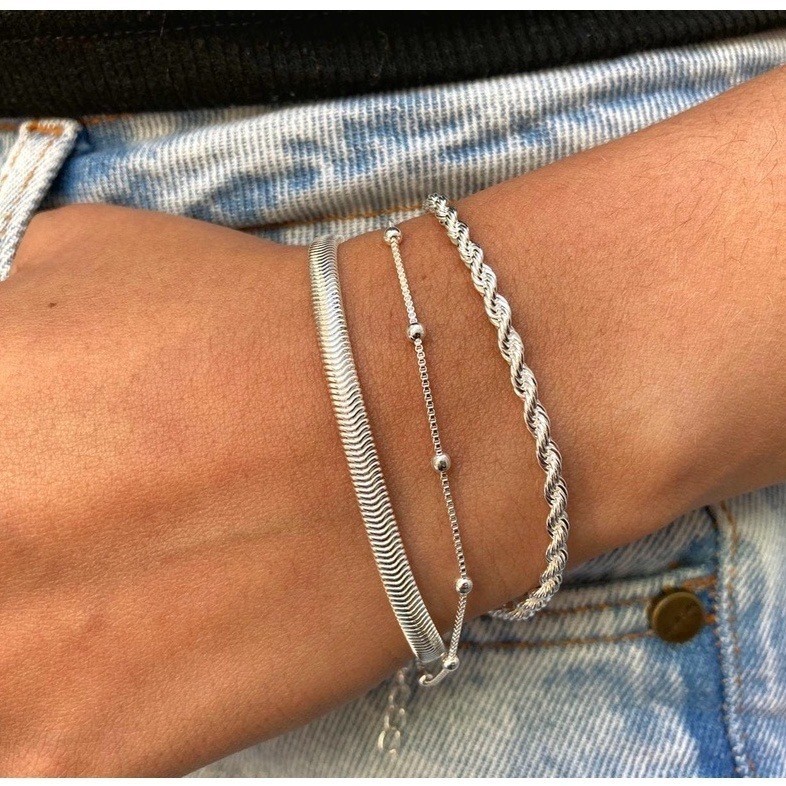 Kit 3 Pulseiras Prata 925 Folheada Cordão Baiano Torcido Conjunto Pulseira Feminina Riviera Corrente Grumet Elos Grosso