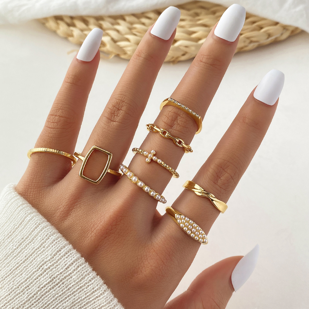 Estilo Europeu Americano Novo Estilo Europeu Estilo Quadrado de Arroz Anel Cruzado de Contas de Arroz Conjunto de 8 peças Índice Único Anel de Junção de Dedos Jóias de Casal de Cauda