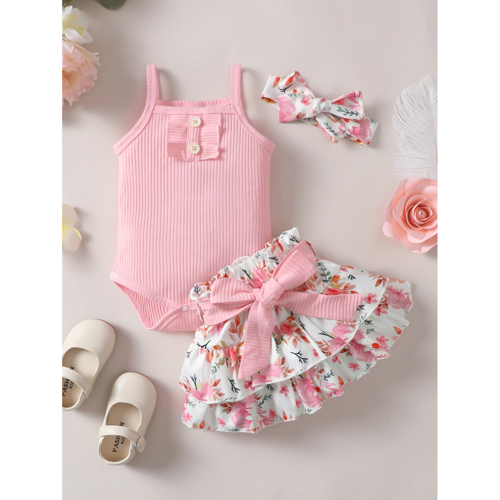 0-2 Anos de idade Recém-nascido Baby Girl Summer Pink Purple Apricot Green Sling Romper com saia estampada Fashion Suit