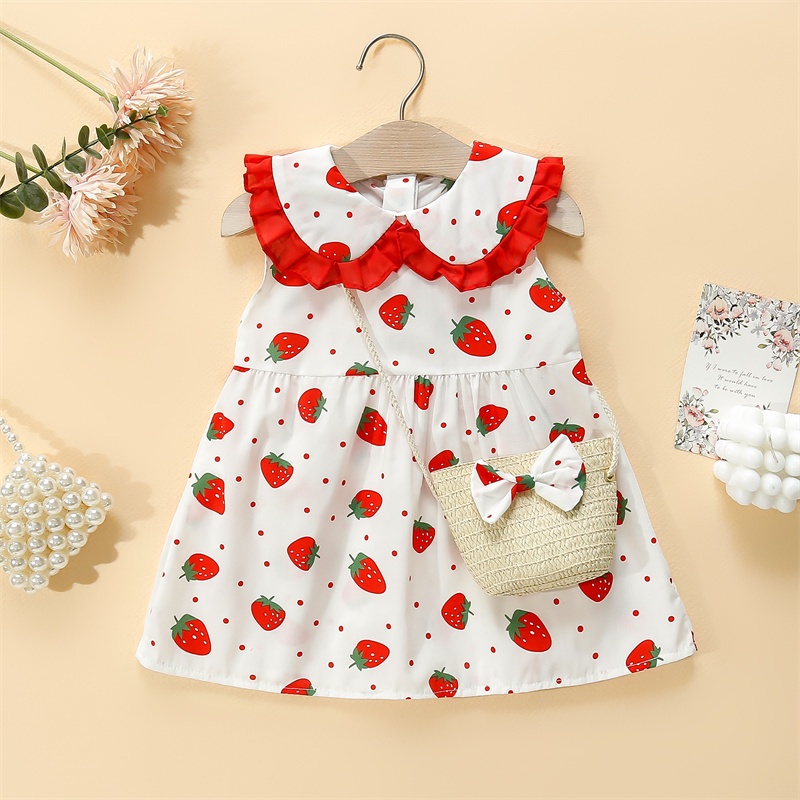 Summer New Strawberry Flip Collar Baby Girl Dress Fashionable E Sweet Children'S Sleeveless Clothes + Bag (9 Meses-3 Anos De Idade)