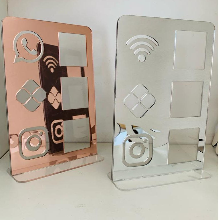Placa Display de Mesa e Balcão para QR Code WHATSAPP PIX INSTAGRAM no MDF Branco e Acrílico Dourado Espelhado