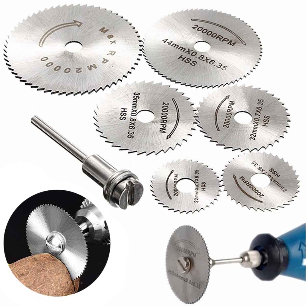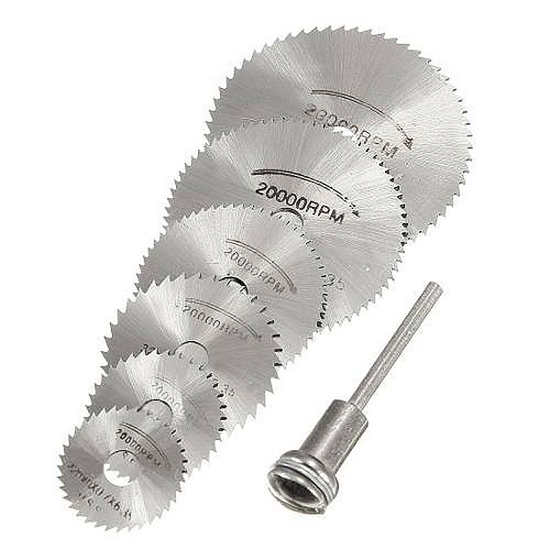 Kit 7pcs Mini Discos Serra Circular Pontas Montadas Hss P/ Micro Retificador Furadeira Retifica Dremel 20000 RPM + Haste 1/8 Corta Madeira Metal Plástico Alumínio Cano EVA Laminado MDF PVC Acessórios de Corte Profissional Jogo Ferramenta Resistente