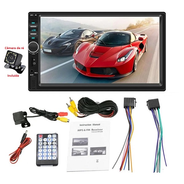 Central Multimídia Mp5 7 Polegadas 2 Din USB Led Colorido Bluetooth GPS Espelha Ios Android com Câmera Ré Quadrada 4 Leds e Sensor de Estacionamento Ré 4 Sensores Sem Visor com Sinal Sonoro