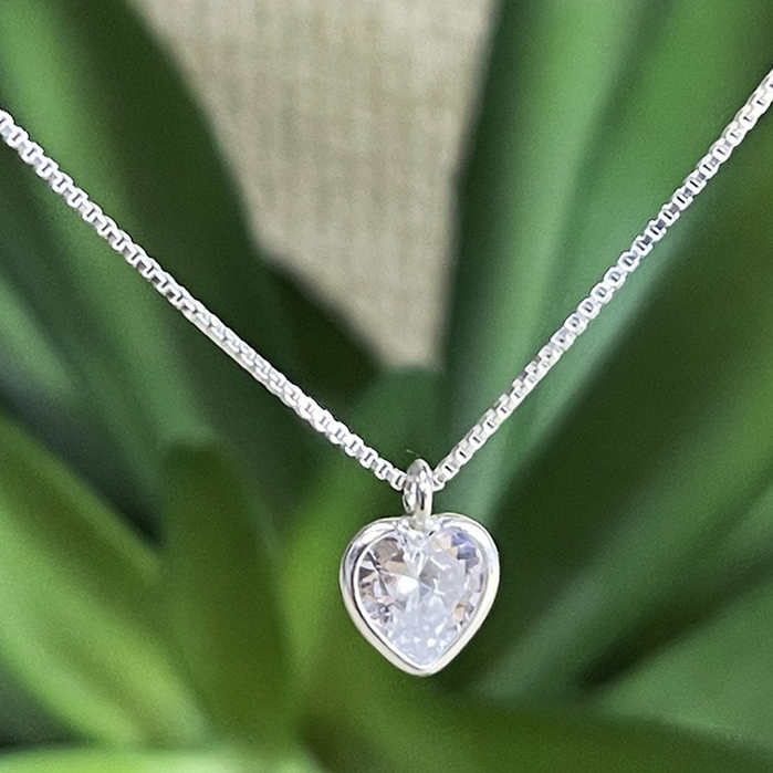 Corrente Colar Feminina Delicada com Pingente Ponto de Luz coração Pedra Zircônia em Prata 925