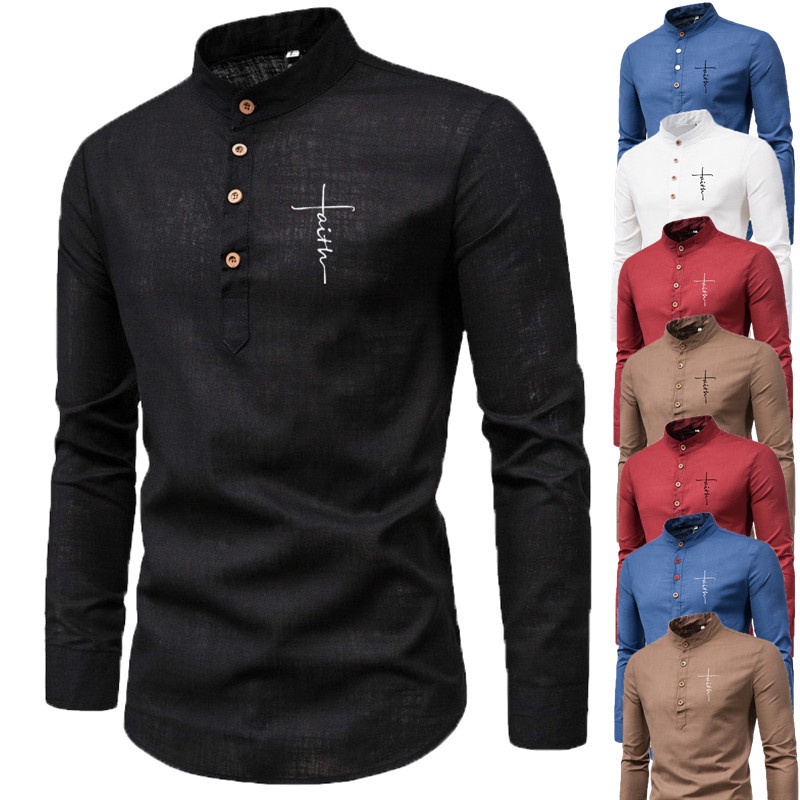 2023 Camisa de manga comprida de algodão e linho para homens de cor sólida camisa de gola elegante slim masculino