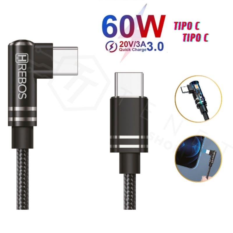 Cabo Tipo C USB-C 90° Graus Turbo 60W Para Gamers