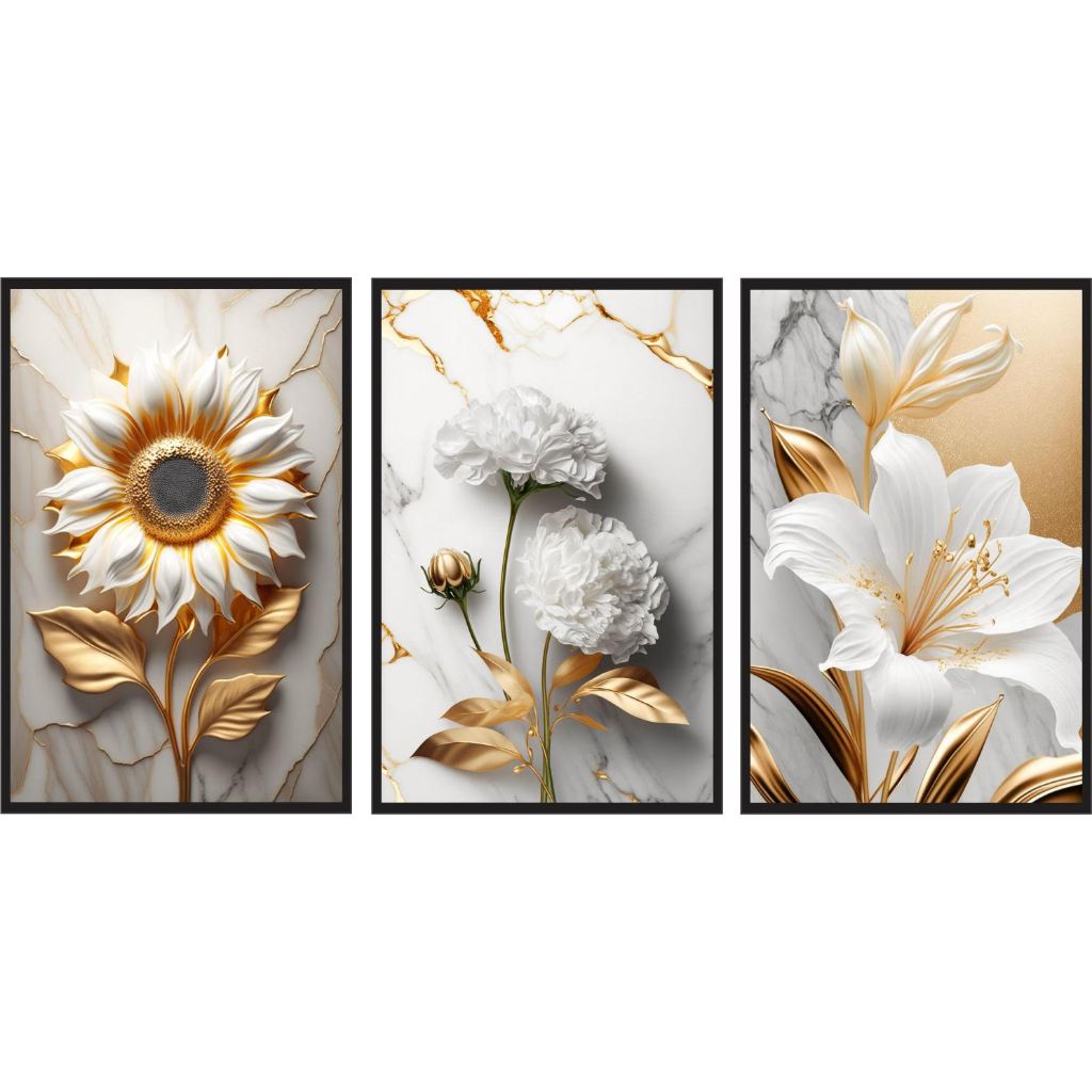 Quadro decorativo flores brancas e douradas girassol, cravo e lírios luxo gold 3 peças