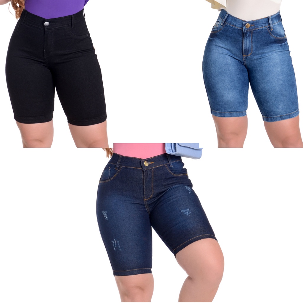 Kit Com 3 Bermudas Femininas Jeans Cintura Alta Até o Joelho Lycra