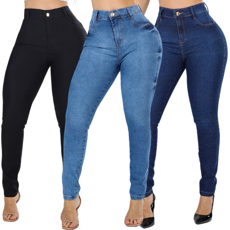 Kit 3 Calças Feminina Cintura Alta Lycra Jeans Com Lycra Elastano Cós Alto Até o Umbigo Modelagem Levanta Bumbum