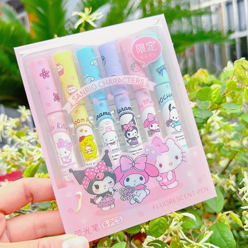 6Pcs/Set Cartoon Sanrio Kuromi Mymelody Highlighter Canetas Multicor para Estudante e Decoração de Manual