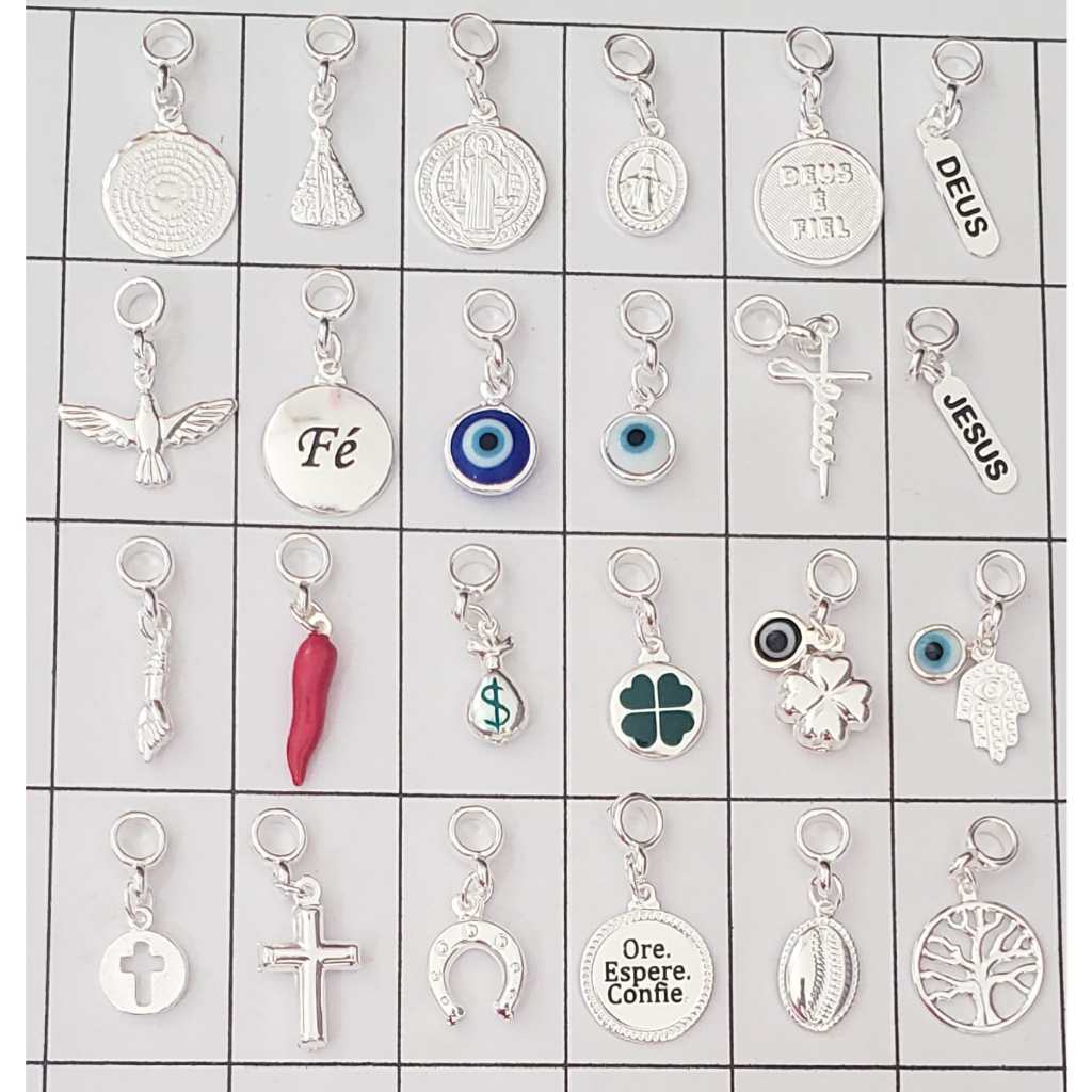 Berloque Pingente Religião e Patuá Olho Grego Deus Pai Nosso Oração Fé Trevo Cruz Ferradura São Bento Jesus Figa