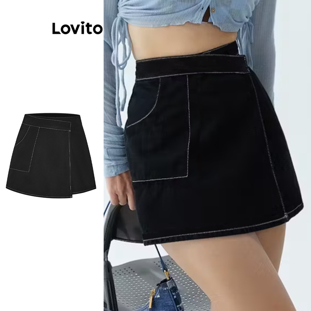 Lovito Shorts Saia com Bolso Zíper Lateral para Mulheres L59ED080 (Preto)